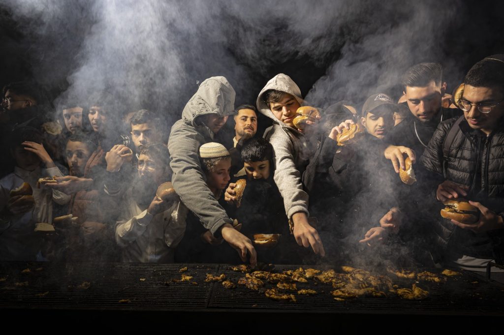 גברים וילדים מצטופפים ליד מנגל סעודת מצווה בעת ההילולה השנתית לכבוד הבאבא סאלי.